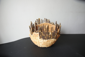 Een keramiek schilderij met porseleinen staafjes die gelijk zijn aan bamboe stokjes.Het kan ook als decoratie schaal neergezet worden.