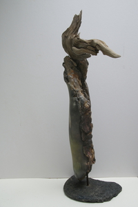 Dit object waarin strandhout is verwerkt, staat voor een rots in de branding.
